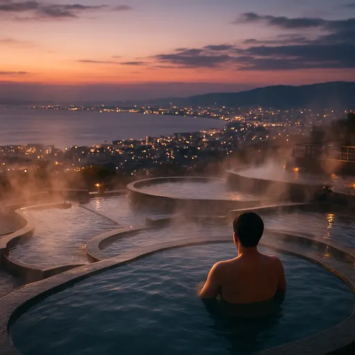 바로 연결된 대형 노천탕 ‘타나유’는 여러 단으로 이어지는 계단식 설계가 특징입니다. 탕에 몸을 담그면 시야를 가리는 요소가 거의 없어 도시와 바다가 한 프레임에 들어옵니다. 낮의 파란 풍경과 밤의 불빛은 분위기가 전혀 달라 시간대를 달리해 두 번 즐기면 만족도가 큽니다.
